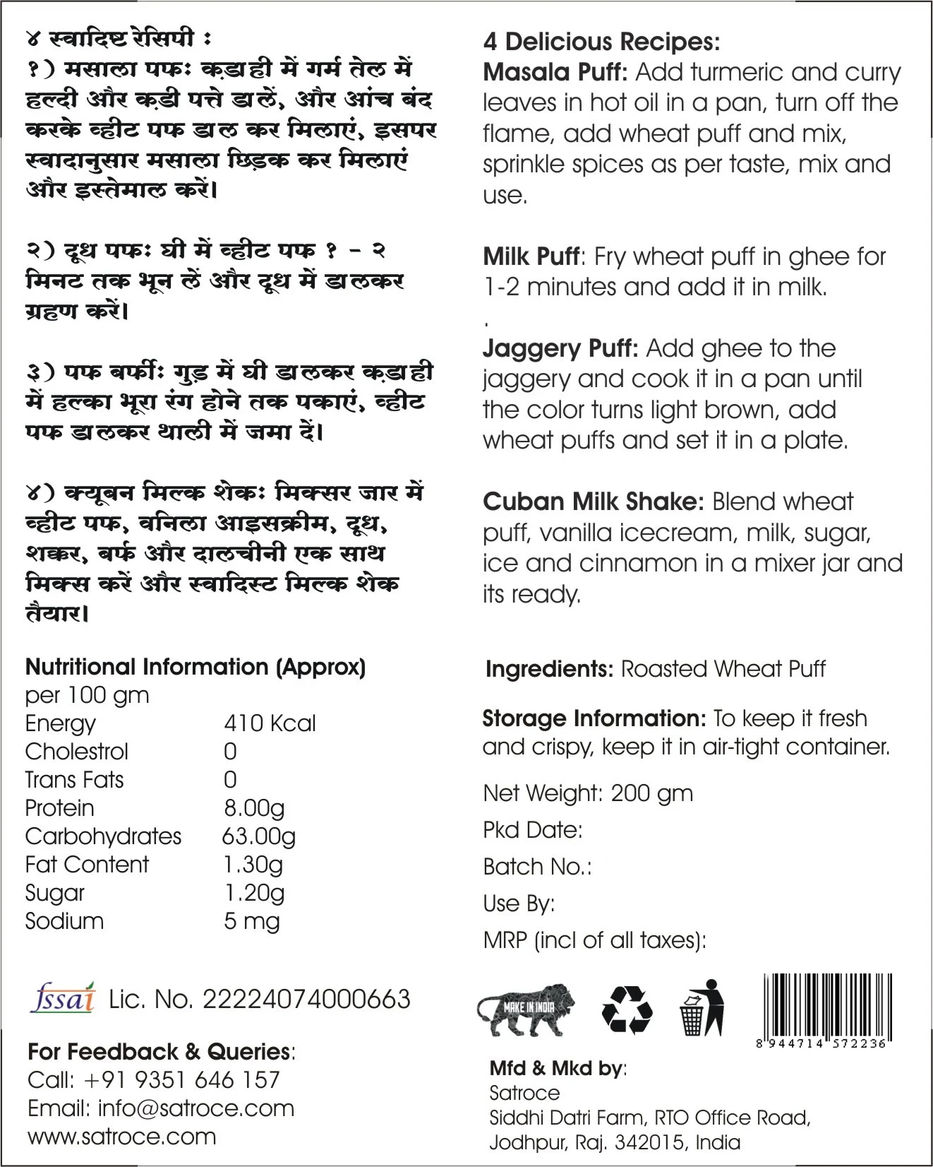 Enjoy a light, wholesome snack with Satroce Plain Wheat Puff. Roasted (not fried) to deliver a crisp texture and packed in a resealable pouch to preserve freshness. With No Salt Added, it’s a naturally mild and healthy choice for family breakfasts, lunchbox treats, or anytime munching.